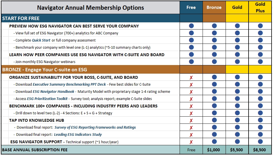 Requirements (same for all Join options): must be a for-profit company – large and mid-size companies (e.g., revenue of $100MM+ or 100+ employees). ESG Navigator is not available (or intended for) professional service firms (consultancies, law firms, etc.).